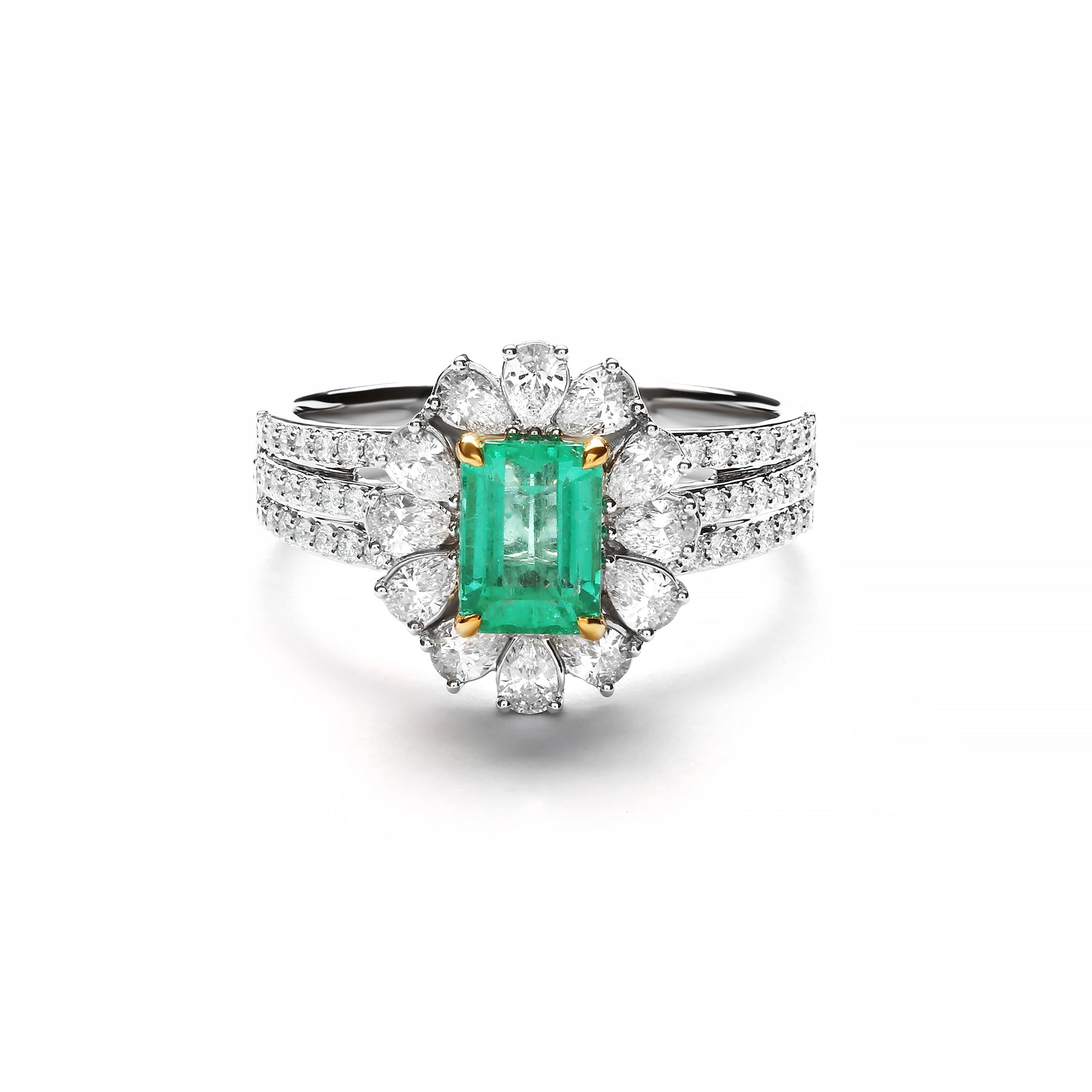 Diamond Ring on White + Yellow Gold 18 K With Emerald Gem Stone
